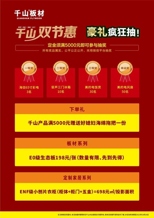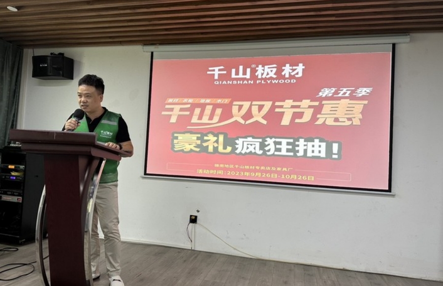 2023年9月26日,千山板材第五屆雙節(jié)惠暨千山板材新品發(fā)布會在江西省贛州市火爆開啟!活動時間長達(dá)一個月,工廠直供,產(chǎn)品質(zhì)量優(yōu)異,價格實(shí)打?qū)崈?yōu)惠!本次活動不僅為消費(fèi)者提供了勁爆的優(yōu)惠政策,更是奉上了一系列驚喜豪禮與真摯服務(wù)。