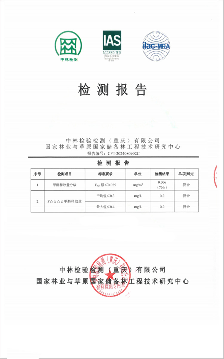 實木大刨片采用無醛MDI膠,安全性、穩定性高,防水性能更佳。經權威檢測,甲醛釋放量為0.017mg/m3,達HENF標準要求,同時通過ENF級和F4星雙檢測。