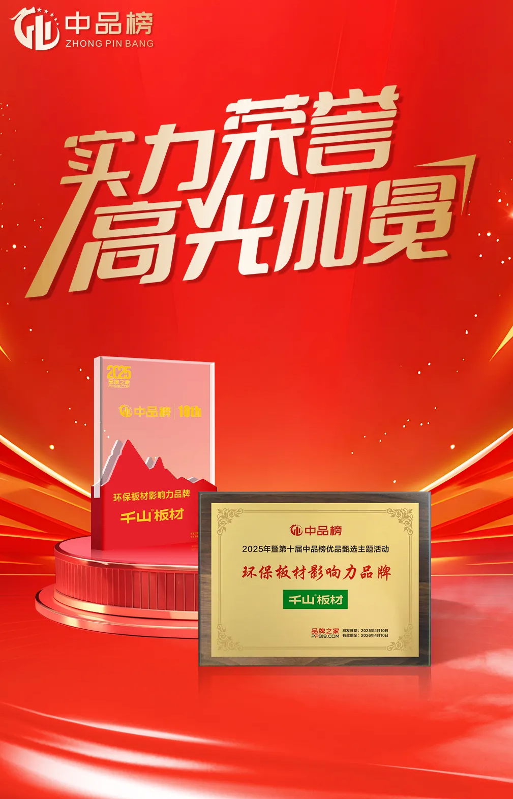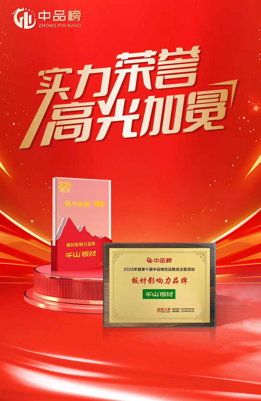 2025年4月,歷時(shí)三個(gè)多月的第十屆“中品榜”優(yōu)品甄選活動(dòng)圓滿落幕,板材大品牌榜單正式揭曉!千山板材憑借卓越產(chǎn)品力和強(qiáng)大市場(chǎng)表現(xiàn)力,再次成為行業(yè)焦點(diǎn),斬獲四項(xiàng)重量級(jí)大獎(jiǎng):“板材十大品牌”、“環(huán)保板材十大品牌”、“家具板十大品牌”、“消費(fèi)者信賴十大品牌”。