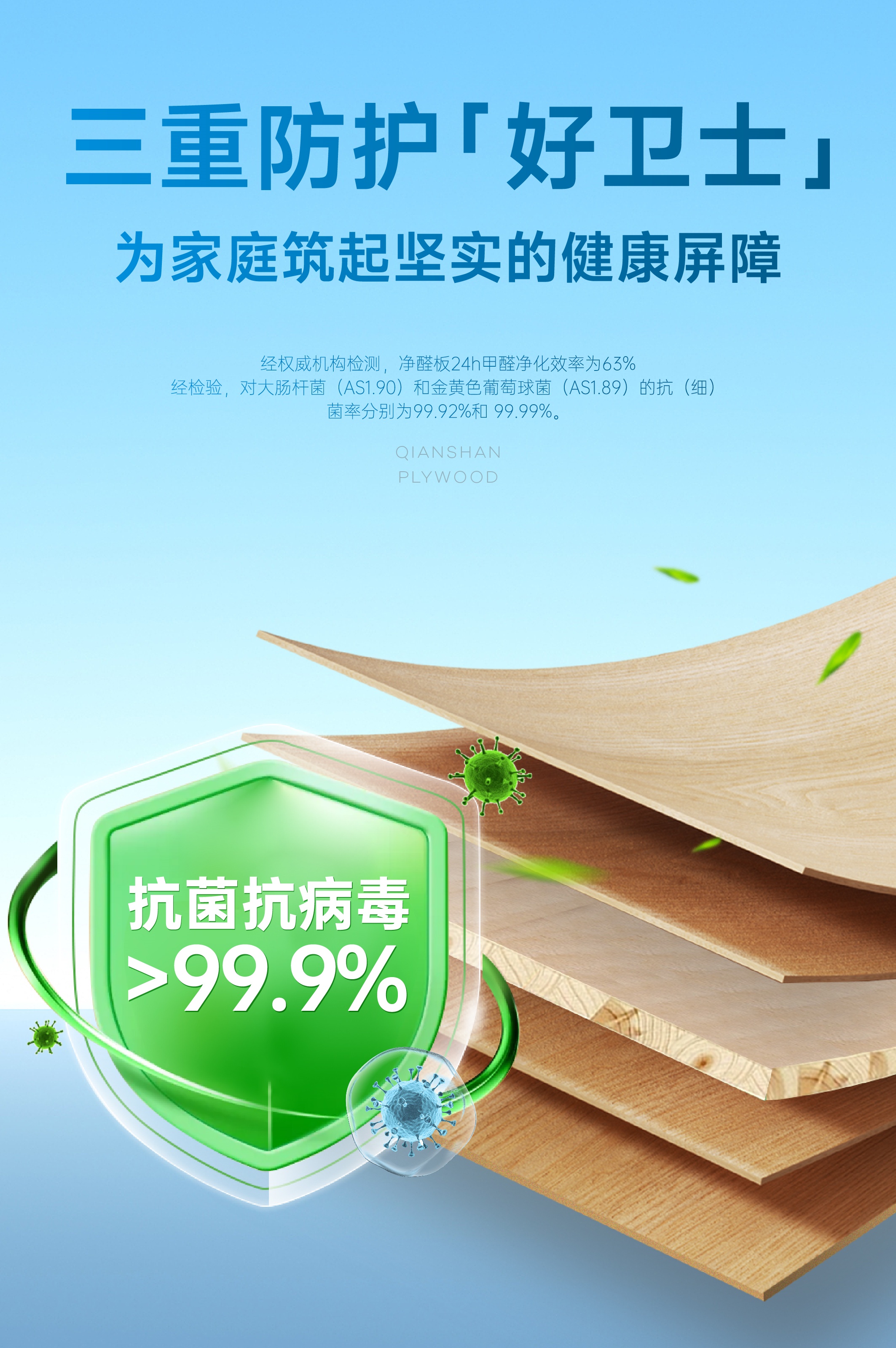 在HENF級和F4星雙環(huán)保標(biāo)準(zhǔn)之上,千山板材具有凈醛、抗菌、抗病毒三重防護。經(jīng)權(quán)威機構(gòu)檢測,凈醛板對大腸桿菌(AS1.90)和金黃色葡萄球菌(AS1.89)的抗(細(xì))菌率分別為99.92%和99.99%。對甲型流感病毒H1N1的抗病毒活性率為>99.9%。